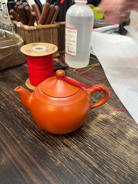 Personally think this basic clay teapot is simply gorgeous. I was advised never to wash it, to allow a patina to develop on the outside and “seasoning” on the inside. It’s suggested only use this pot with one type of tea, and I think this will be my oolong pot once I get home.