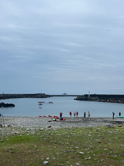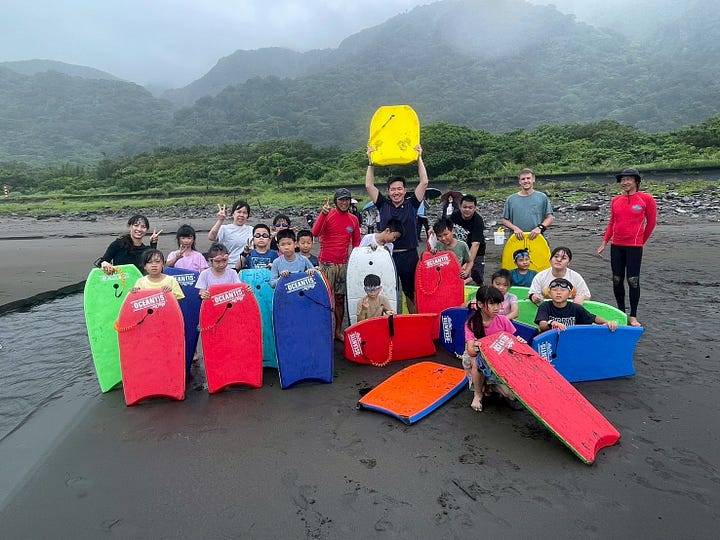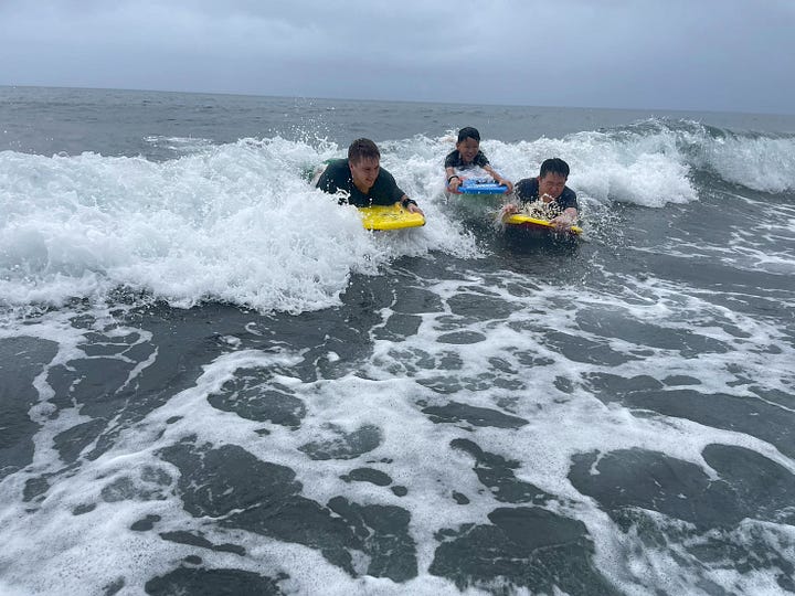 On Thursday, my branch campus had another field trip in Daxi Village, home to Taiwan’s third-largest fishing port. Our first stop was Daxi Elementary School, where we had a boogie boarding lesson.7 The weather was awful; wind and rain were swirling everywhere, but the ocean was warm and calm, so we paid no mind to the weather and got straight to business. Most of my students hadn’t boogie boarded before, and seeing them light up when catching a wave was super cool. I don’t find boogie boarding particularly exciting on its own, but doing it alongside my students was pure belly-laughing exhilaration. A few teachers and our principal all got in on the action, and our hour in the water passed before we knew it.