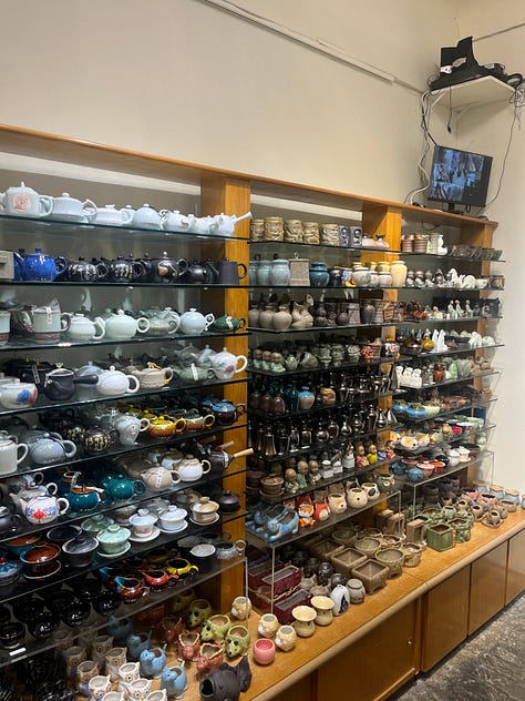 Sore and tired, I woke up Sunday morning to head to New Taipei’s Yingge District with my host family. This district has been the epicenter of Taiwan’s ceramics industry for over 100 years and is the place to go if you want cheap, high-quality pottery. I was in the market for a tea set to bring back home and figured this district would have the best selection and prices anywhere in Taiwan. Yingge’s Old Street has an overwhelming amount of ceramics stores, which are each individually overwhelming to enter. I spent the early afternoon shopping, my host dad browsing with me and providing a helpful second set of eyes. Machine-made teapots ranged from $5-20 USD, while the handmade pieces were mostly $40 US and up. The first few stores I entered were really fancy, with a limited selection of teapots and cups designed for specific types of tea, most well over $100. There were some cool teapots, but I’m glad I kept exploring, as I found a small, hole-in-the-wall shop with tons of options. I found a simple handmade teapot and 6 bone white cups to go along with it. All in around $70 USD.4